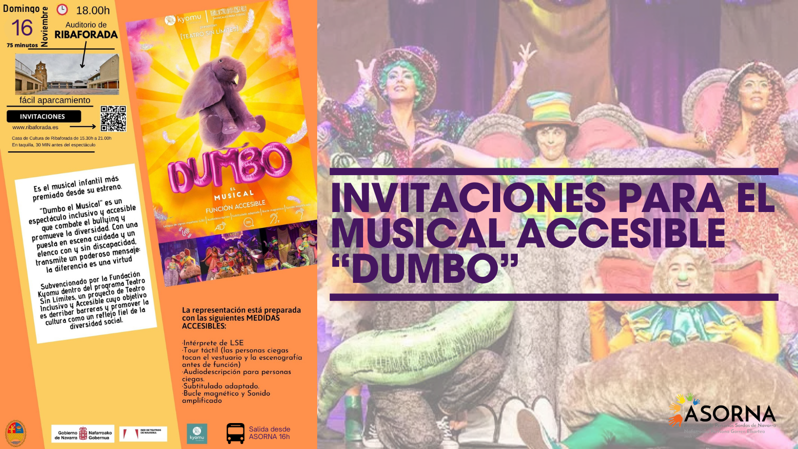 Desde el Ayuntamiento de Ribaforada nos invitan a acudir al espectáculo teatral ACCESIBLE «Dumbo el Musical» el 16 de noviembre, a las 18h en el Auditorio de Ribaforada. Preparada con las siguientes MEDIDAS ACCESIBLES: Intérprete de LSE Subtitulado adaptado. Bucle magnético y Sonido amplificado Tour táctil (las personas ciegas tocan el vestuario y la escenografía antes de función)...Leer más